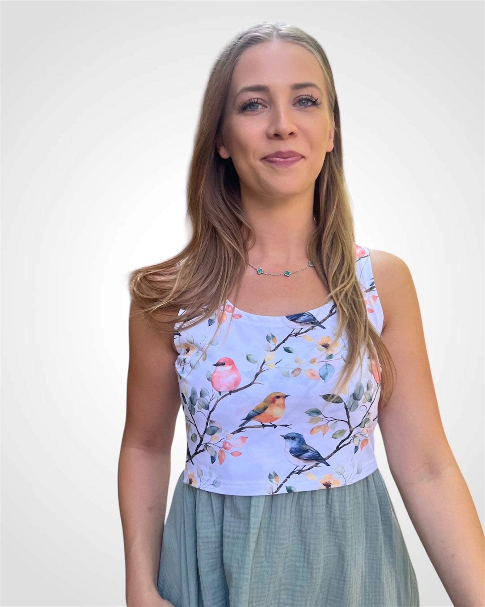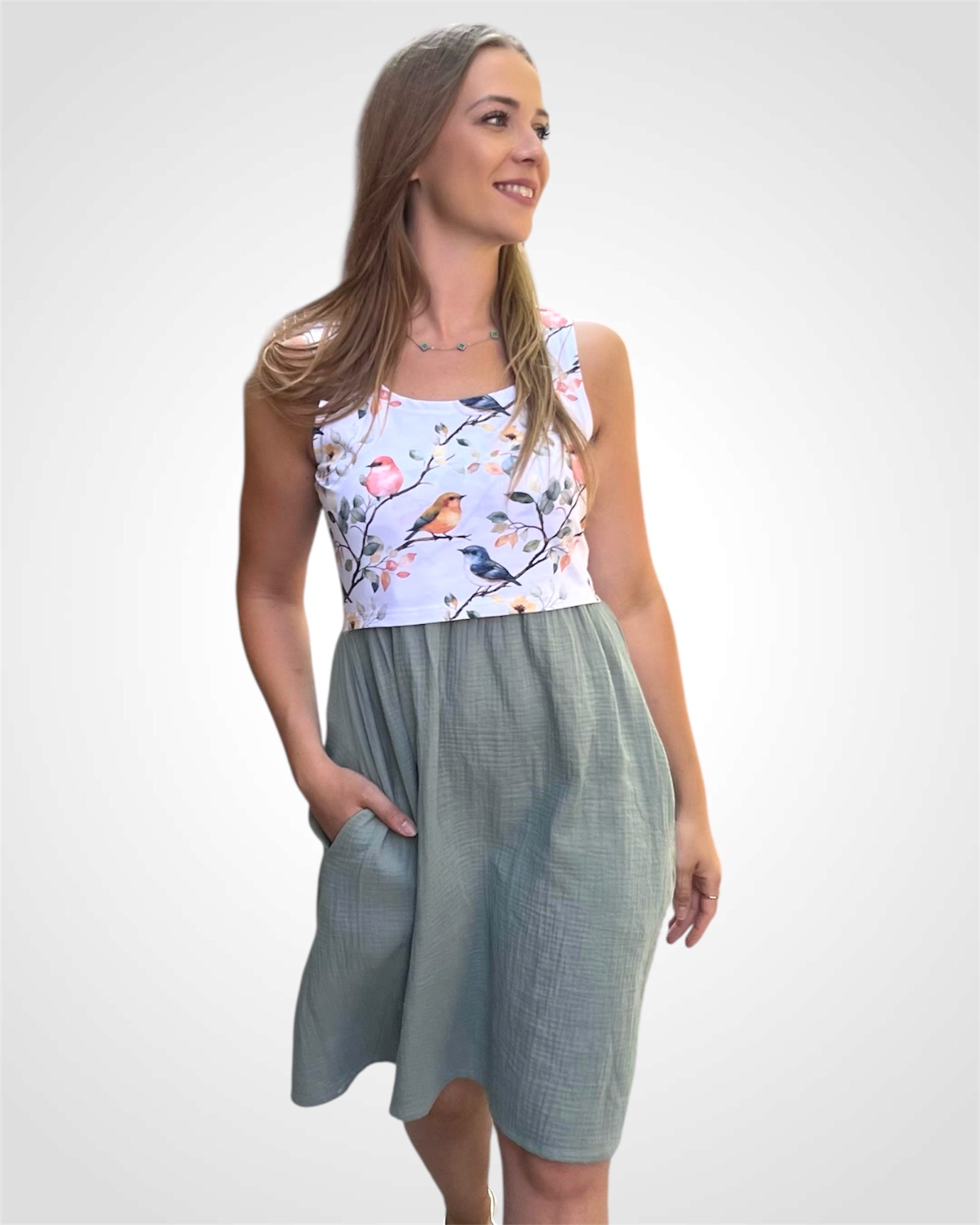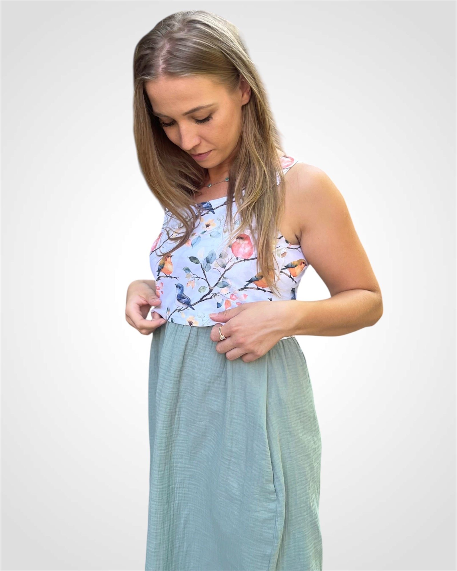 Vrchná časť z mäkkého bavlneného úpletu umožňuje jednoduché a diskrétne dojčenie, zatiaľ čo mušelínová sukňa dodáva modelu vzdušnosť a ľahkosť. Mušelín je obľúbený pre svoje priedušné, savé a rýchloschnúce vlastnosti, vďaka čomu sa skvele nosí počas teplejších dní.